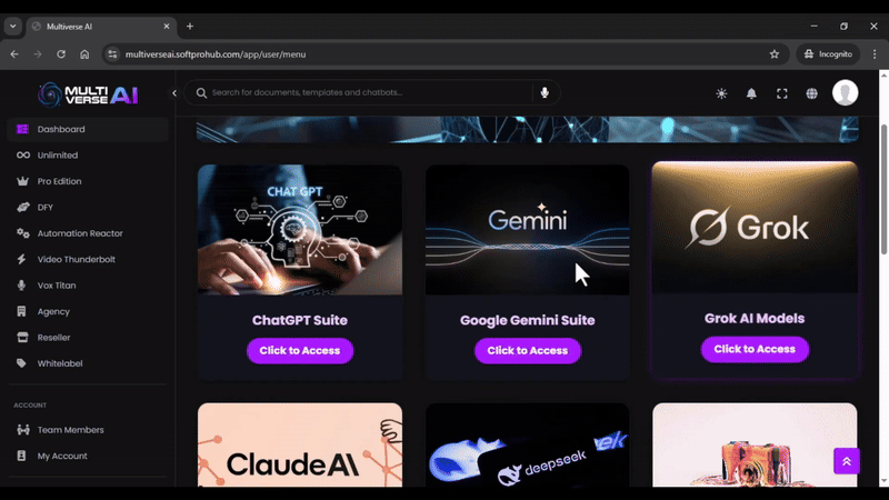 Unlike other tools that lock you into just one AI engine, Multiverse AI lets you use ChatGPT (3.5 to 5), Claude, Gemini, Grok, DALL·E, Stable Diffusion, ElevenLabs, DeepSeek, Kling, Veo, Flux AI, Meta LLaMA and more… all from one place.